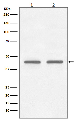 Western blot analysis of (1) HepG2 cell lysate; (2) K562 cell lysate. Using FNTB (bsm-61262R) monoclonal antibody at 1:1000 dilution and 4°C overnight incubation. Followed by conjugated secondary antibody incubation at r.t. for 60 min.