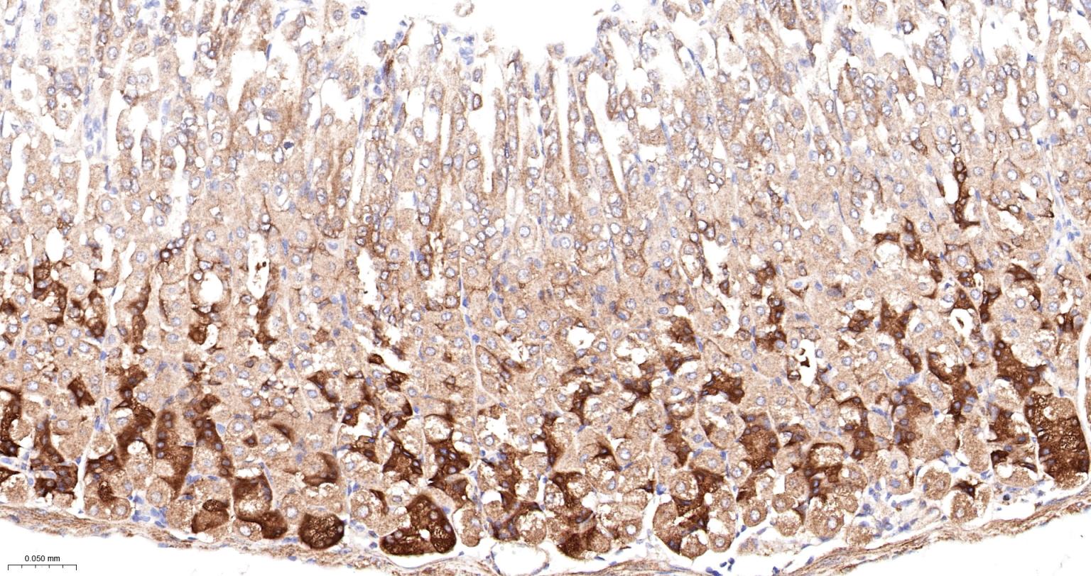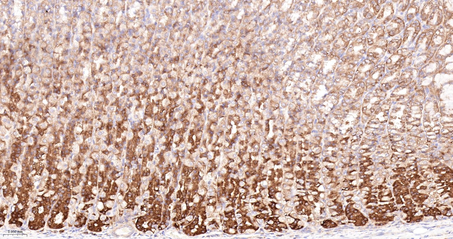 Paraformaldehyde-fixed, paraffin embedded Mouse Stomach; Antigen retrieval by boiling in sodium citrate buffer (pH6.0) for 15 min; The section was incubated with RALBP1 Monoclonal Antibody, Unconjugated (bsm-61265R) at 1:200 overnight at 4°C, followed by conjugation to the bs-0295G-HRP and DAB (C-0010) staining.