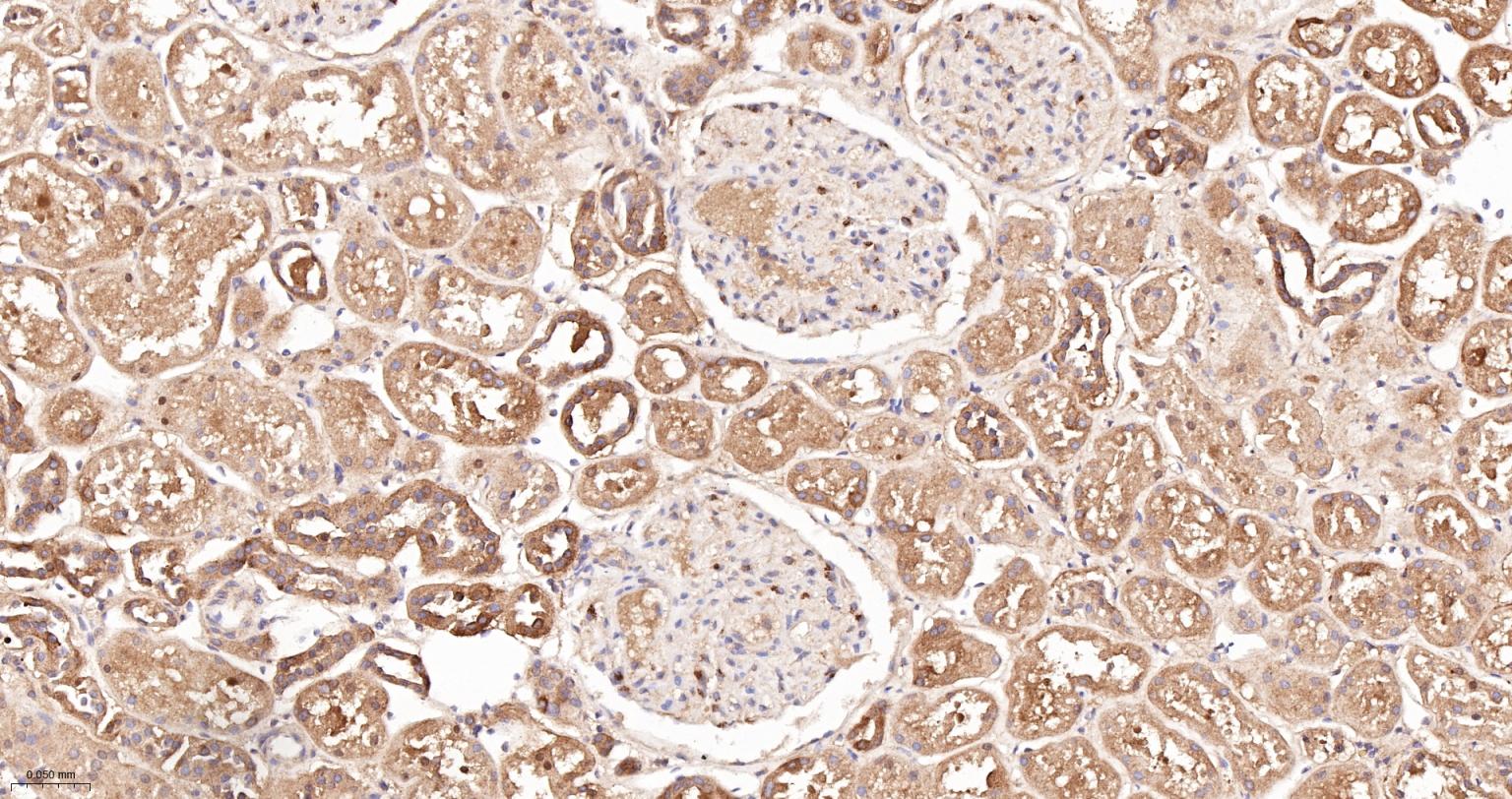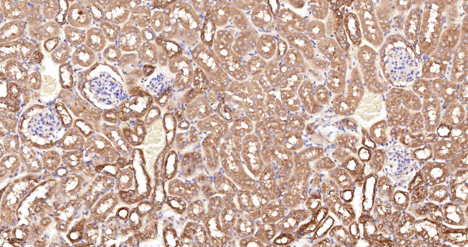Paraformaldehyde-fixed, paraffin embedded Mouse Kidney; Antigen retrieval by boiling in sodium citrate buffer (pH6.0) for 15 min; The section was incubated with RALBP1 Monoclonal Antibody, Unconjugated (bsm-61265R) at 1:200 overnight at 4°C, followed by conjugation to the bs-0295G-HRP and DAB (C-0010) staining.