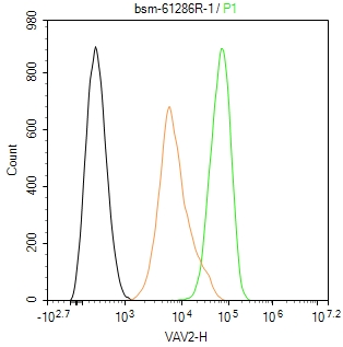 The Hela (H) cells were fixed with 4% PFA (10 min at r.t.) and then permeabilized with 90% ice-cold methanol for 20 min at -20℃,the cells then were incubated in 5%BSA to block non-specific protein-protein interactions (30 min at r.t.), followed by secondary antibody incubation for 40 min at room temperature. Primary Antibody (green):Rabbit Anti-VAV2 antibody (bsm-61286R,1:100); Isotype Control (orange): Rabbit IgG (bs-0295P). Blank control (black): PBS. Acquisition of 20,000 events was performed.