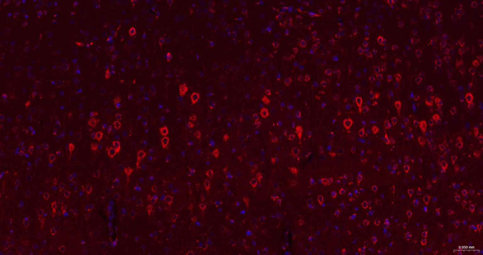 Paraformaldehyde-fixed, paraffin embedded Rat Cerebrum; Antigen retrieval by boiling in sodium citrate buffer (pH6.0) for 15 min; The section was incubated with VAV2 Monoclonal Antibody, Unconjugated (bsm-61286R) at 1:200 overnight at 4°C. Followed by conjugated Goat Anti-Ratbbit IgG antibody (Red, bs-0295G-BF594), DAPI (blue, C02-04002) was used to stain the cell nuclei.