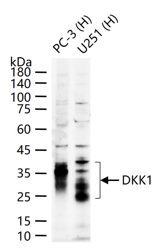 25 ug total protein per lane of various lysates (see on figure) probed with DKK1 monoclonal antibody, unconjugated (bsm-61289R) at 1:2000 dilution and 4°C overnight incubation. Followed by conjugated secondary antibody incubation at r.t. for 60 min.