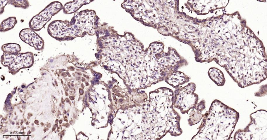 Paraformaldehyde-fixed, paraffin embedded Human Placenta; Antigen retrieval by boiling in sodium citrate buffer (pH6.0) for 15 min; Antibody incubation with DKK1 Monoclonal Antibody, Unconjugated(bsm-61289R) at 1:200 overnight at 4°C, followed by conjugation to the bs-0295G-HRP and DAB (C-0010) staining.