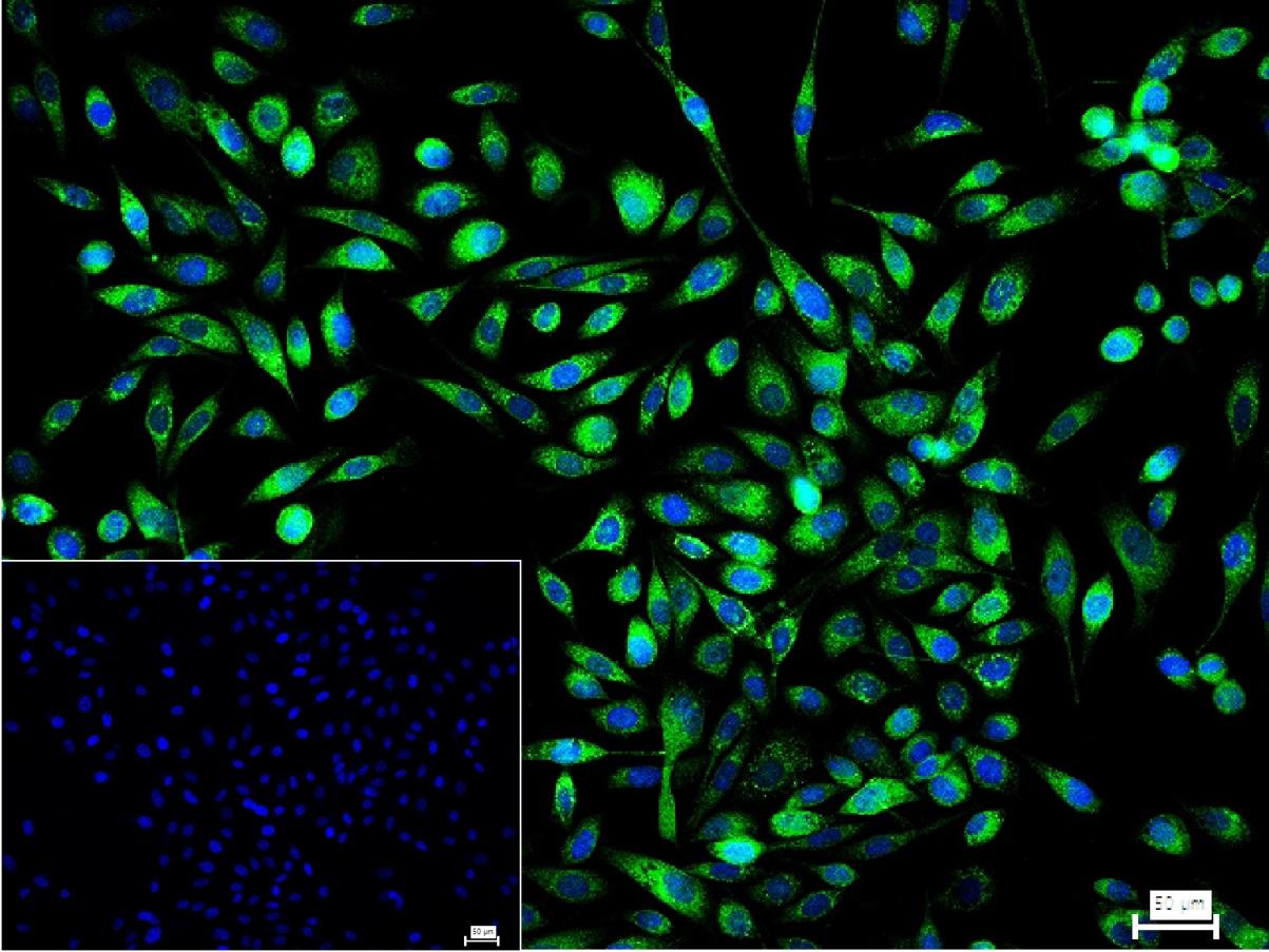 4% Paraformaldehyde-fixed PC-3 (H) cell; Triton X-100 at r.t. for 20 min; Antibody incubation with (DKK1) monoclonal Antibody, unconjugated (bsm-61289R) 1:100, 90 min at 37°C; followed by conjugated Goat Anti-Rabbit IgG antibody (green, bs-60295G-BF488) at 37°C for 90 min, DAPI (blue, C02-04002) was used to stain the cell nuclei. PBS instead of the primary antibody was used as the blank control.