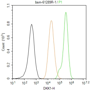 The PC-3 (H) cells were fixed with 4% PFA (10 min at r.t.) and then permeabilized with 90% ice-cold methanol for 20 min at -20℃,the cells then were incubated in 5%BSA to block non-specific protein-protein interactions (30 min at r.t.), followed by secondary antibody incubation for 40 min at room temperature. Primary Antibody (green):Rabbit Anti-DKK1 antibody (bsm-61289R,1:100); Isotype Control (orange): Rabbit IgG (bs-0295P). Blank control (black): PBS. Acquisition of 20,000 events was performed.