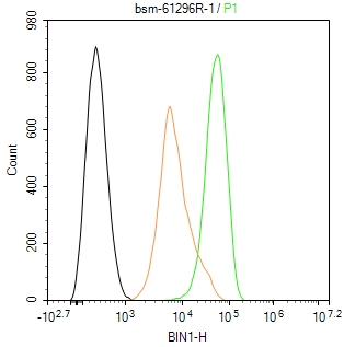 The Hela (H) cells were fixed with 4% PFA (10 min at r.t.) and then permeabilized with 90% ice-cold methanol for 20 min at -20℃,the cells then were incubated in 5%BSA to block non-specific protein-protein interactions (30 min at r.t.), followed by secondary antibody incubation for 40 min at room temperature. Primary Antibody (green):Rabbit Anti-BIN1 antibody (bsm-61296R,1:100); Isotype Control (orange): Rabbit IgG (bs-0295P). Blank control (black): PBS. Acquisition of 20,000 events was performed.