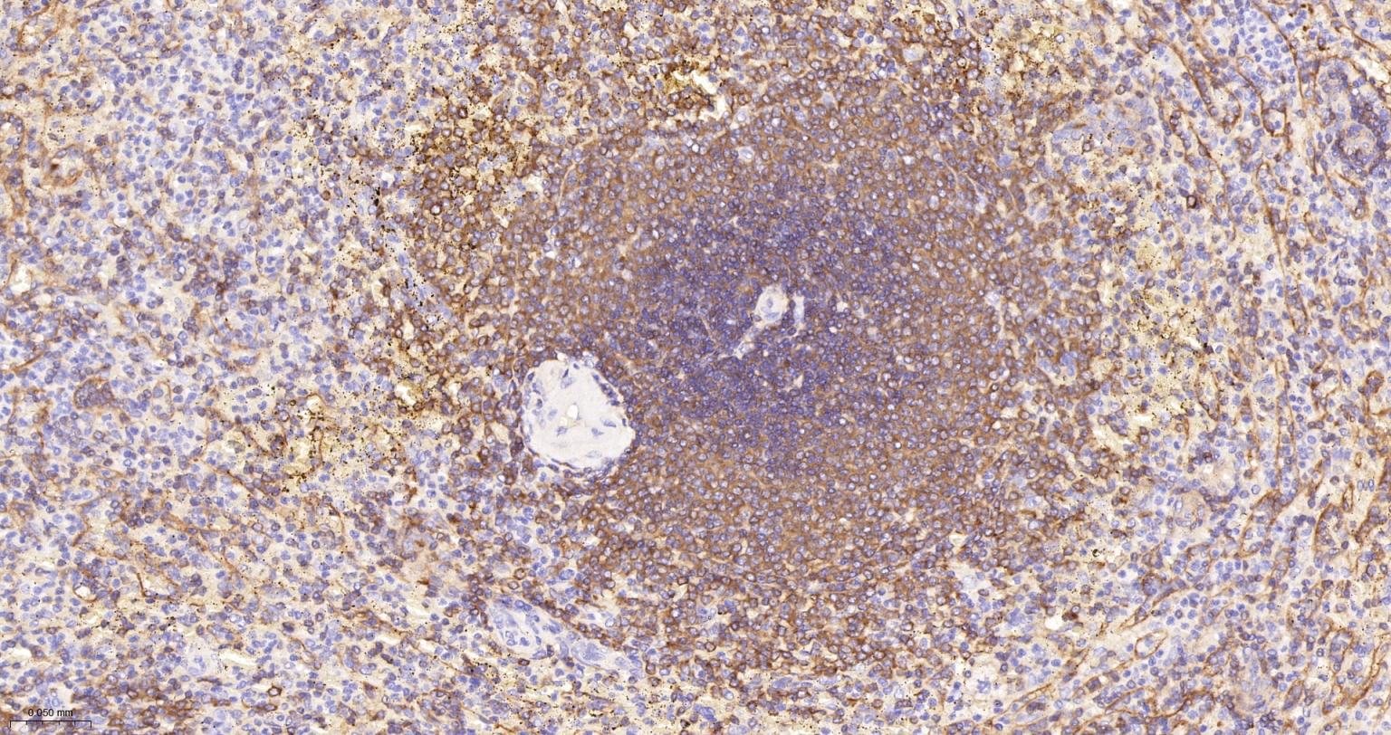 Paraformaldehyde-fixed, paraffin embedded Mouse Spleen; Antigen retrieval by boiling in sodium citrate buffer (pH6.0) for 15 min; The section was incubated with BIN1 Monoclonal Antibody, Unconjugated (bsm-61296R) at 1:200 overnight at 4°C, followed by conjugation to the bs-0295G-HRP and DAB (C-0010) staining.