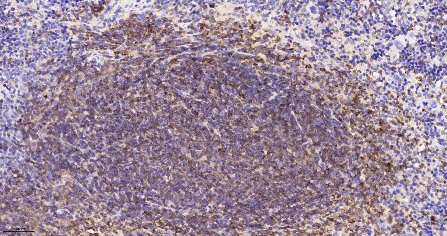 Paraformaldehyde-fixed, paraffin embedded Human Spleen; Antigen retrieval by boiling in sodium citrate buffer (pH6.0) for 15 min; The section was incubated with BIN1 Monoclonal Antibody, Unconjugated (bsm-61296R) at 1:200 overnight at 4°C, followed by conjugation to the bs-0295G-HRP and DAB (C-0010) staining.