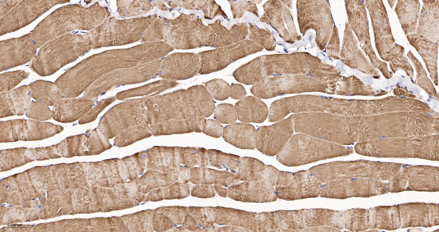 Paraformaldehyde-fixed, paraffin embedded Mouse Skeletal muscle; Antigen retrieval by boiling in sodium citrate buffer (pH6.0) for 15 min; The section was incubated with BIN1 Monoclonal Antibody, Unconjugated (bsm-61296R) at 1:200 overnight at 4°C, followed by conjugation to the bs-0295G-HRP and DAB (C-0010) staining.