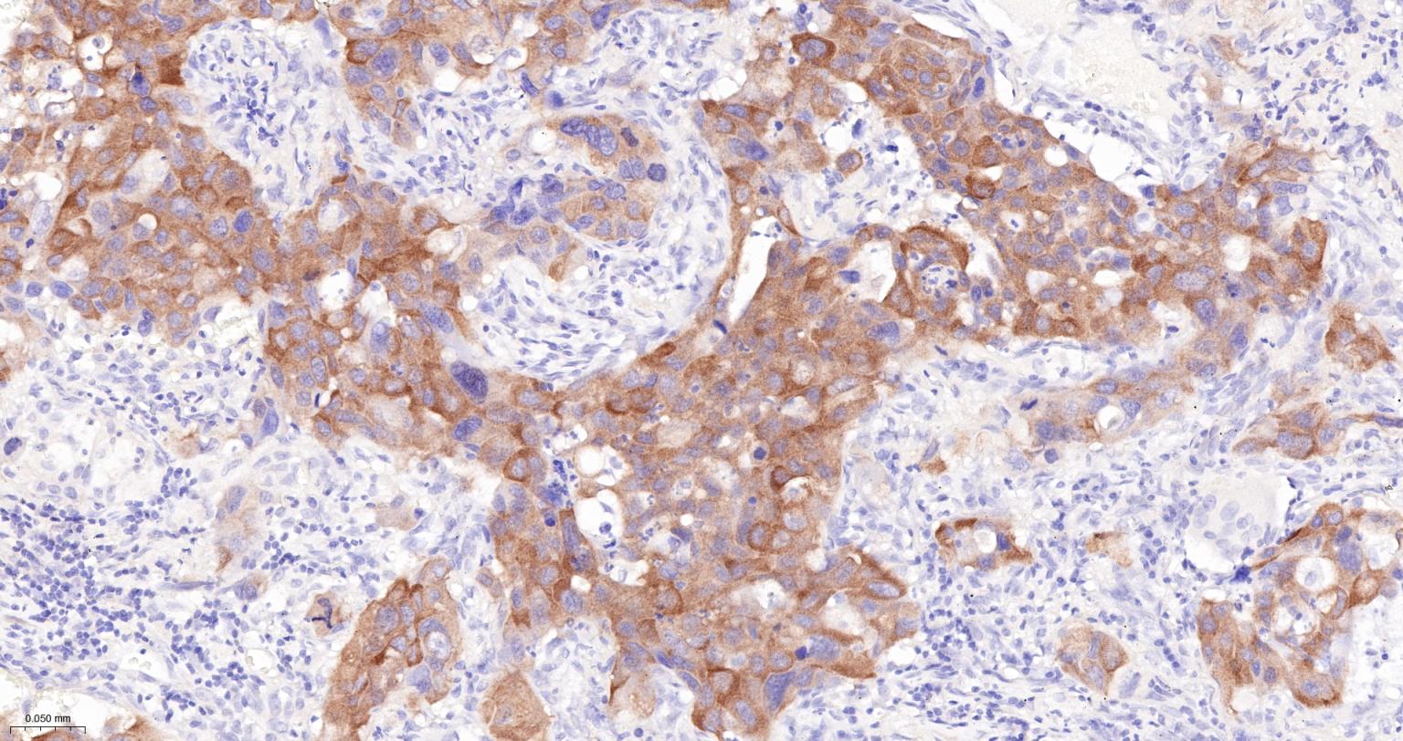 Paraformaldehyde-fixed, paraffin embedded Human Lung Cancer; Antigen retrieval by boiling in sodium citrate buffer (pH6.0) for 15 min; The section was incubated with INPP4B Monoclonal Antibody, Unconjugated (bsm-61303R) at 1:200 overnight at 4°C, followed by conjugation to the bs-0295G-HRP and DAB (C-0010) staining.