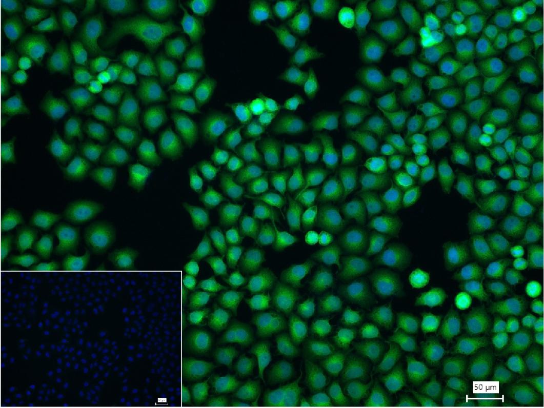 4% Paraformaldehyde-fixed Hela (H) cell; Triton X-100 at r.t. for 20 min; Antibody incubation with (MEK7) monoclonal Antibody, unconjugated (bsm-61322R) 1:100, 90 min at 37°C; followed by conjugated Goat Anti-Rabbit IgG antibody (green, bs-40295G-FITC) at 37°C for 90 min, DAPI (blue, C02-04002) was used to stain the cell nuclei. PBS instead of the primary antibody was used as the blank control.