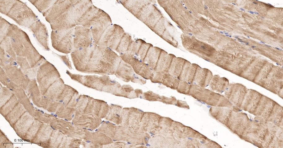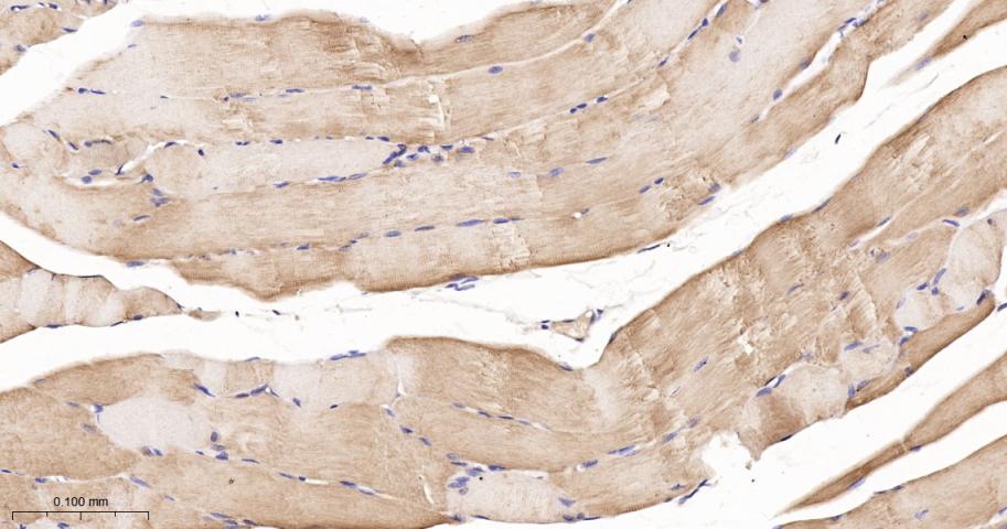 Paraformaldehyde-fixed, paraffin embedded Mouse Skeletal muscle; Antigen retrieval by boiling in sodium citrate buffer (pH6.0) for 15 min; The section was incubated with MEK7 Monoclonal Antibody, Unconjugated (bsm-61322R) at 1:200 overnight at 4°C, followed by conjugation to the bs-0295G-HRP and DAB (C-0010) staining.