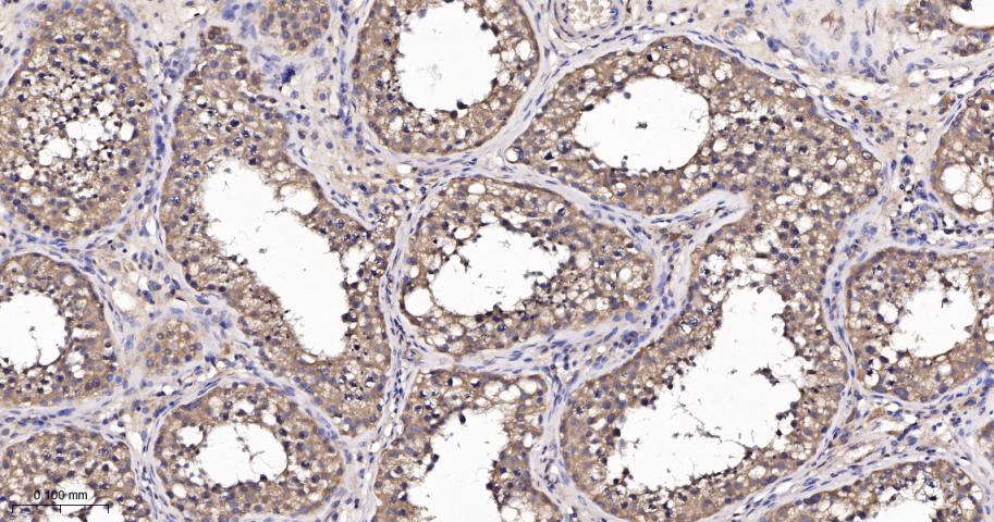 Paraformaldehyde-fixed, paraffin embedded Human Testicles; Antigen retrieval by boiling in sodium citrate buffer (pH6.0) for 15 min; The section was incubated with MEK7 Monoclonal Antibody, Unconjugated (bsm-61322R) at 1:200 overnight at 4°C, followed by conjugation to the bs-0295G-HRP and DAB (C-0010) staining.