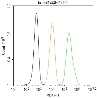 The Hela (H) cells were fixed with 4% PFA (10 min at r.t.) and then permeabilized with 90% ice-cold methanol for 20 min at -20℃,the cells then were incubated in 5%BSA to block non-specific protein-protein interactions (30 min at r.t.), followed by secondary antibody incubation for 40 min at room temperature. Primary Antibody (green):Rabbit Anti-MEK7 antibody (bsm-61322R,1:100); Isotype Control (orange): Rabbit IgG (bs-0295P). Blank control (black): PBS. Acquisition of 20,000 events was performed.