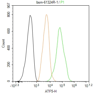 The A431 (H) cells were fixed with 4% PFA (10 min at r.t.) and then permeabilized with 90% ice-cold methanol for 20 min at -20℃,the cells then were incubated in 5%BSA to block non-specific protein-protein interactions (30 min at r.t.), followed by secondary antibody incubation for 40 min at room temperature. Primary Antibody (green):Rabbit Anti-ATF5 antibody (bsm-61324R,1:100); Isotype Control (orange): Rabbit IgG (bs-0295P). Blank control (black): PBS. Acquisition of 20,000 events was performed.