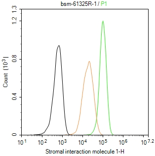 The PANC-1 (H) cells were fixed with 4% PFA (10 min at r.t.) and then permeabilized with 90% ice-cold methanol for 20 min at -20℃,the cells then were incubated in 5%BSA to block non-specific protein-protein interactions (30 min at r.t.), followed by secondary antibody incubation for 40 min at room temperature. Primary Antibody (green):Rabbit Anti-Stromal interaction molecule 1 antibody (bsm-61325R,1:100); Isotype Control (orange): Rabbit IgG (bs-0295P). Blank control (black): PBS. Acquisition of 20,000 events was performed.