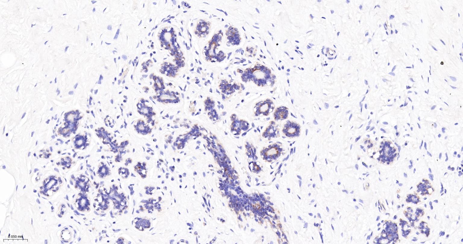 Paraformaldehyde-fixed, paraffin embedded Human Breast; Antigen retrieval by boiling in sodium citrate buffer (pH6.0) for 15 min; The section was incubated with Stromal interaction molecule 1 Monoclonal Antibody, Unconjugated (bsm-61325R) at 1:200 overnight at 4°C, followed by conjugation to the bs-0295G-HRP and DAB (C-0010) staining.