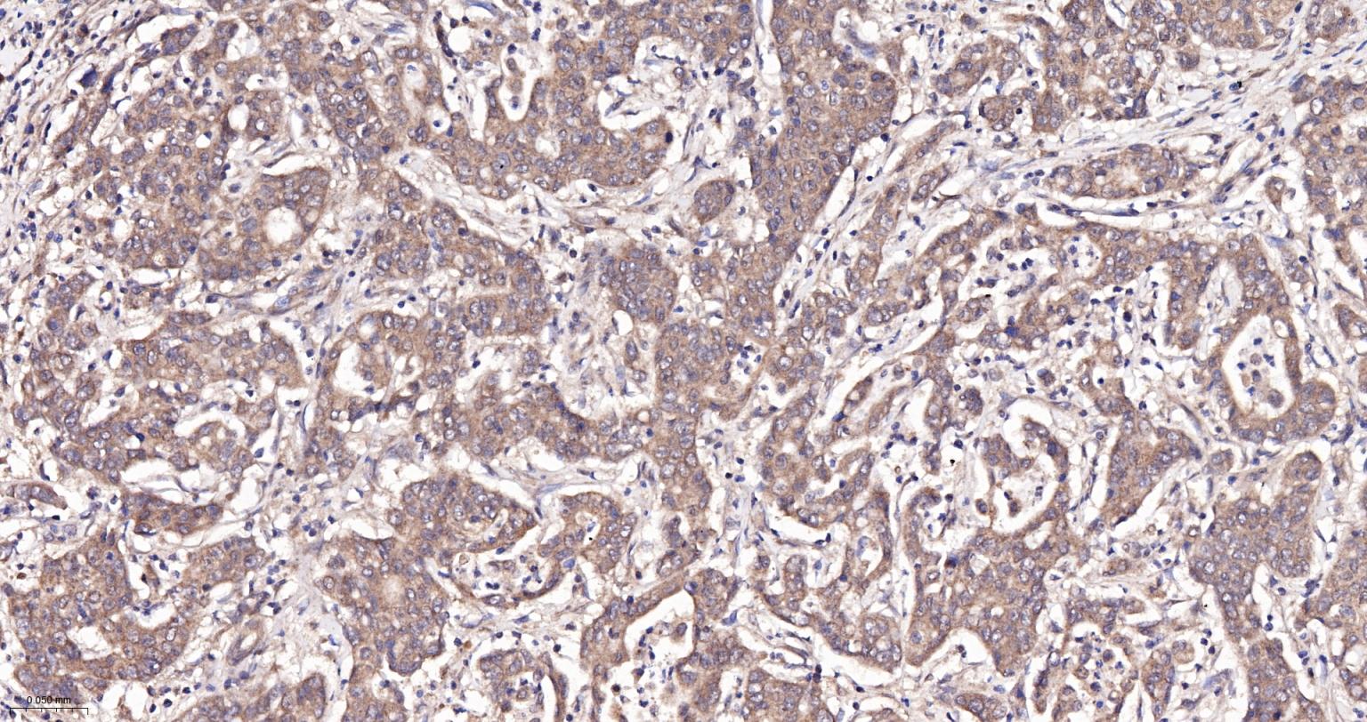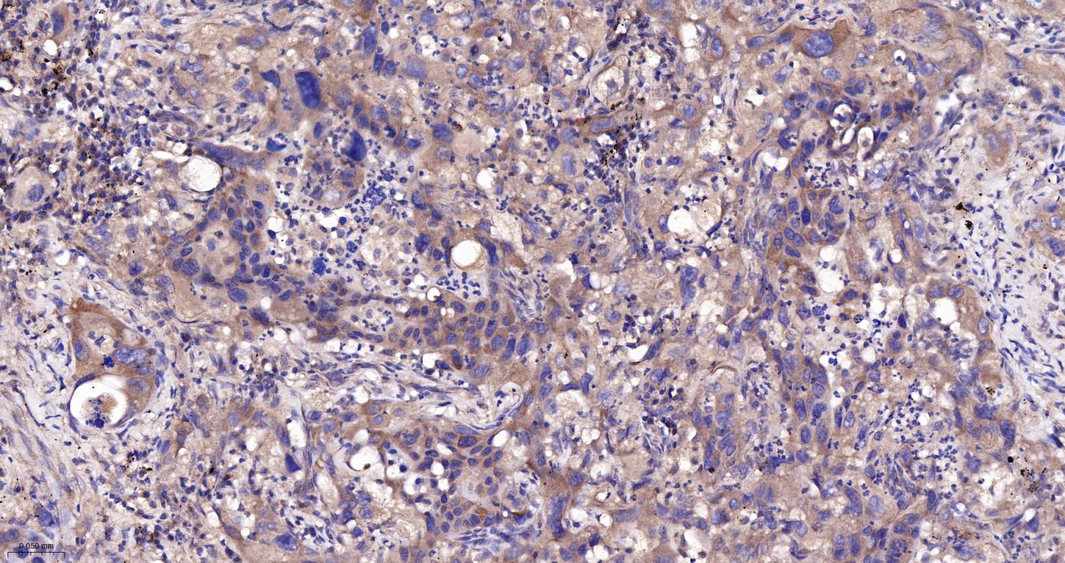 Paraformaldehyde-fixed, paraffin embedded Human Lung Cancer; Antigen retrieval by boiling in sodium citrate buffer (pH6.0) for 15 min; The section was incubated with Ubiquitin D Monoclonal Antibody, Unconjugated (bsm-61330R) at 1:200 overnight at 4°C, followed by conjugation to the bs-0295G-HRP and DAB (C-0010) staining.