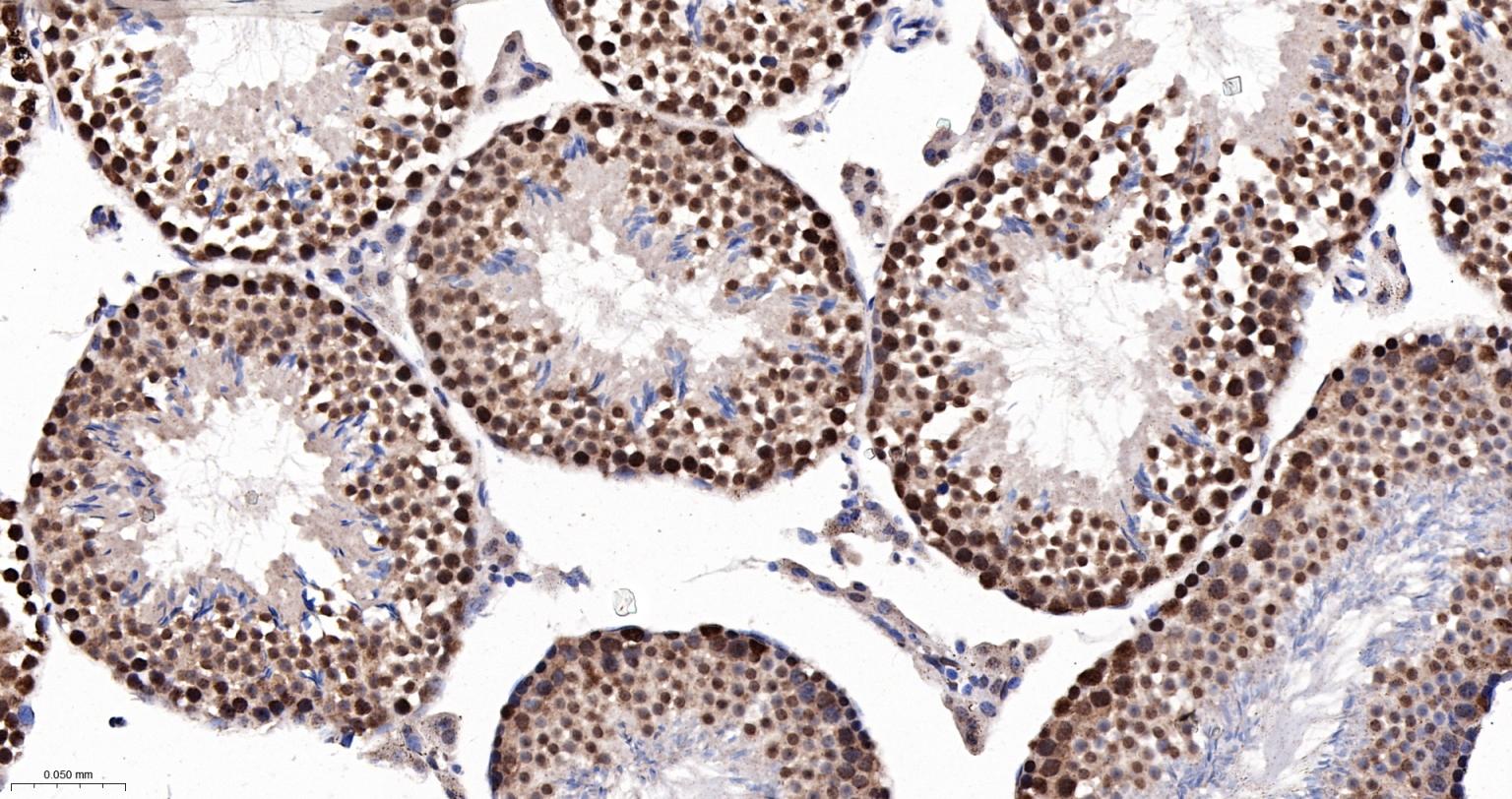 Paraformaldehyde-fixed, paraffin embedded Mouse Testicles; Antigen retrieval by boiling in sodium citrate buffer (pH6.0) for 15 min; The section was incubated with CDC5L Monoclonal Antibody, Unconjugated (bsm-61335R) at 1:200 overnight at 4°C, followed by conjugation to the bs-0295G-HRP and DAB (C-0010) staining.