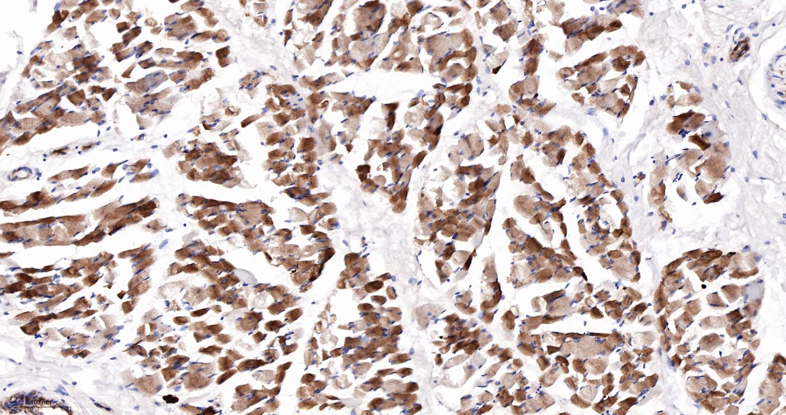 Paraformaldehyde-fixed, paraffin embedded Human Skeletal muscle; Antigen retrieval by boiling in sodium citrate buffer (pH6.0) for 15 min; The section was incubated with HSP22 Monoclonal Antibody, Unconjugated (bsm-61338R) at 1:200 overnight at 4°C, followed by conjugation to the bs-0295G-HRP and DAB (C-0010) staining.