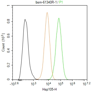 The Hela (H) cells were fixed with 4% PFA (10 min at r.t.) and then permeabilized with 90% ice-cold methanol for 20 min at -20℃,the cells then were incubated in 5%BSA to block non-specific protein-protein interactions (30 min at r.t.), followed by secondary antibody incubation for 40 min at room temperature. Primary Antibody (green):Rabbit Anti-Hsp105 antibody (bsm-61340R,1:100); Isotype Control (orange): Rabbit IgG (bs-0295P). Blank control (black): PBS. Acquisition of 20,000 events was performed.