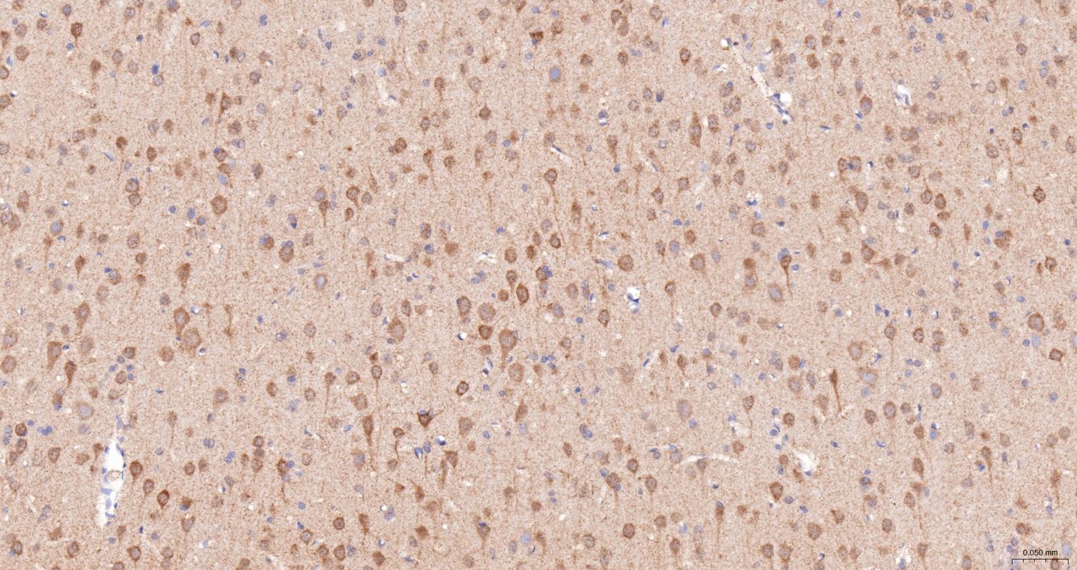 Paraformaldehyde-fixed, paraffin embedded Rat Cerebrum; Antigen retrieval by boiling in sodium citrate buffer (pH6.0) for 15 min; The section was incubated with HSP105 Monoclonal Antibody, Unconjugated (bsm-61340R) at 1:200 overnight at 4°C, followed by conjugation to the bs-0295G-HRP and DAB (C-0010) staining.
