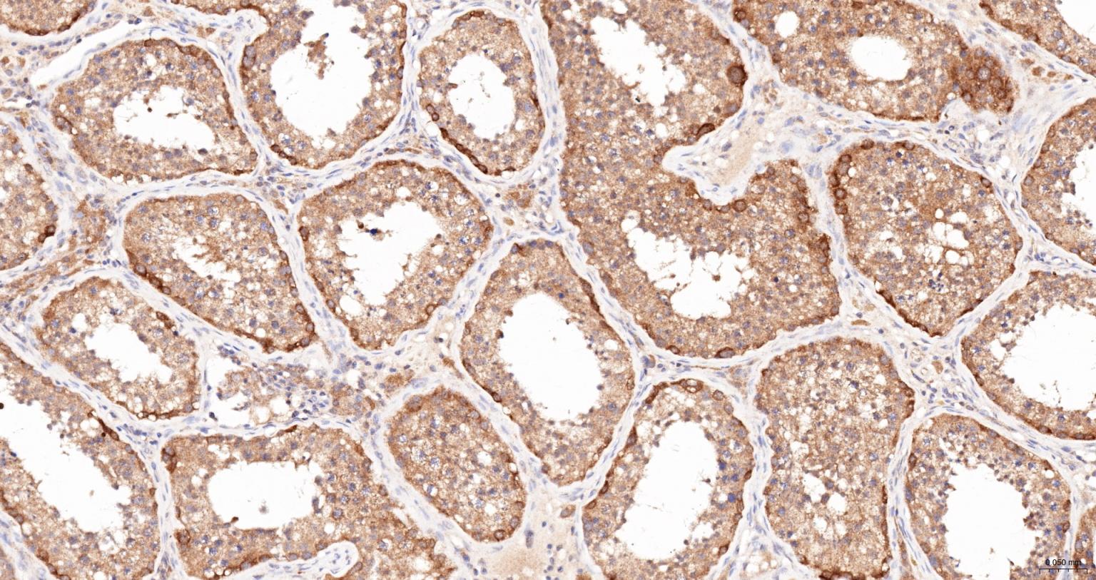 Paraformaldehyde-fixed, paraffin embedded Human Testicles; Antigen retrieval by boiling in sodium citrate buffer (pH6.0) for 15 min; The section was incubated with HSP105 Monoclonal Antibody, Unconjugated (bsm-61340R) at 1:200 overnight at 4°C, followed by conjugation to the bs-0295G-HRP and DAB (C-0010) staining.