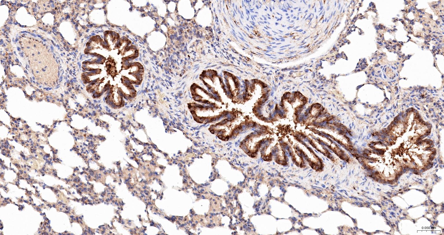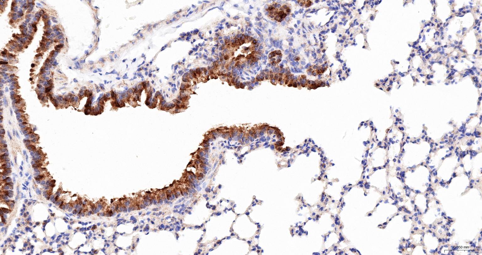 Paraformaldehyde-fixed, paraffin embedded Mouse Lung; Antigen retrieval by boiling in sodium citrate buffer (pH6.0) for 15 min; The section was incubated with HSP105 Monoclonal Antibody, Unconjugated (bsm-61340R) at 1:200 overnight at 4°C, followed by conjugation to the bs-0295G-HRP and DAB (C-0010) staining.