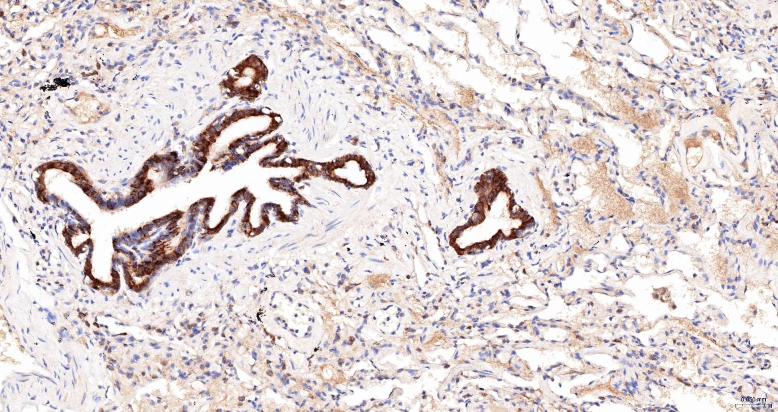 Paraformaldehyde-fixed, paraffin embedded Human Lung; Antigen retrieval by boiling in sodium citrate buffer (pH6.0) for 15 min; The section was incubated with HSP105 Monoclonal Antibody, Unconjugated (bsm-61340R) at 1:200 overnight at 4°C, followed by conjugation to the bs-0295G-HRP and DAB (C-0010) staining.