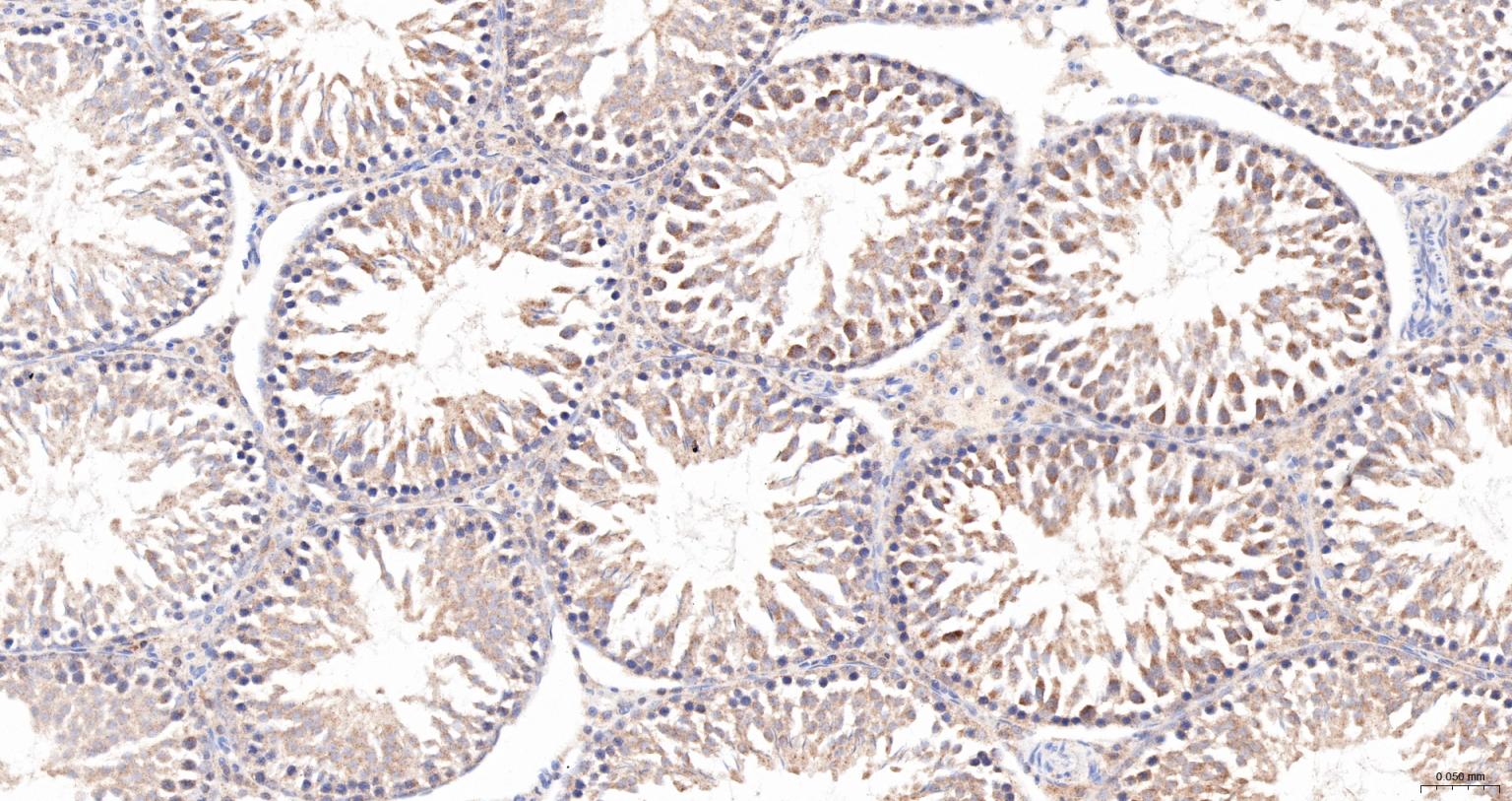 Paraformaldehyde-fixed, paraffin embedded Rat Testicles; Antigen retrieval by boiling in sodium citrate buffer (pH6.0) for 15 min; The section was incubated with HSP105 Monoclonal Antibody, Unconjugated (bsm-61340R) at 1:200 overnight at 4°C, followed by conjugation to the bs-0295G-HRP and DAB (C-0010) staining.