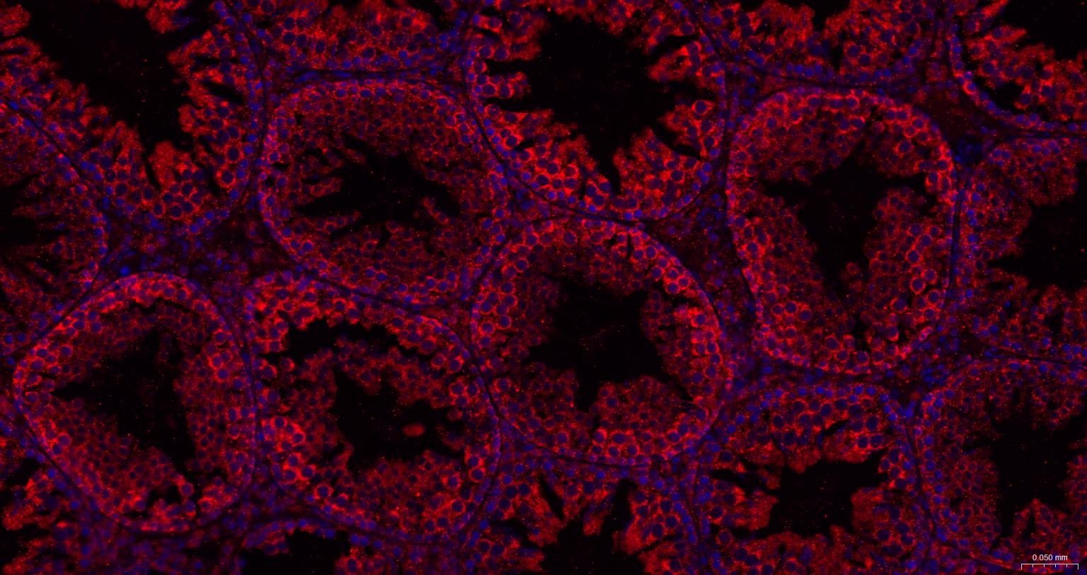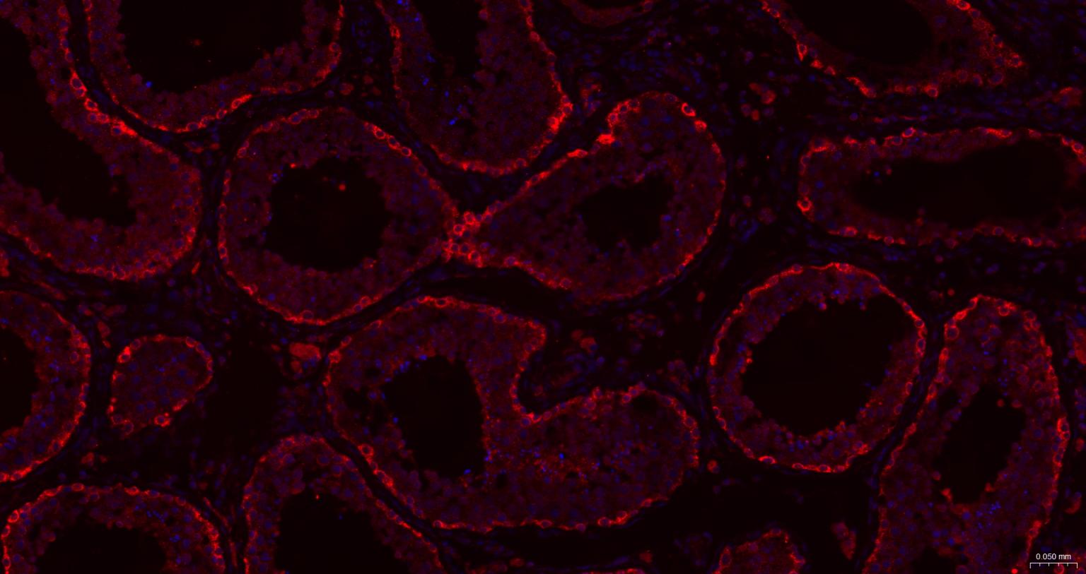 Paraformaldehyde-fixed, paraffin embedded Human Testicles; Antigen retrieval by boiling in sodium citrate buffer (pH6.0) for 15 min; The section was incubated with HSP105 Monoclonal Antibody, Unconjugated (bsm-61340R) at 1:200 overnight at 4°C. Followed by conjugated Goat Anti-Ratbbit IgG antibody (Red, bs-0295G-BF594), DAPI (blue, C02-04002) was used to stain the cell nuclei.