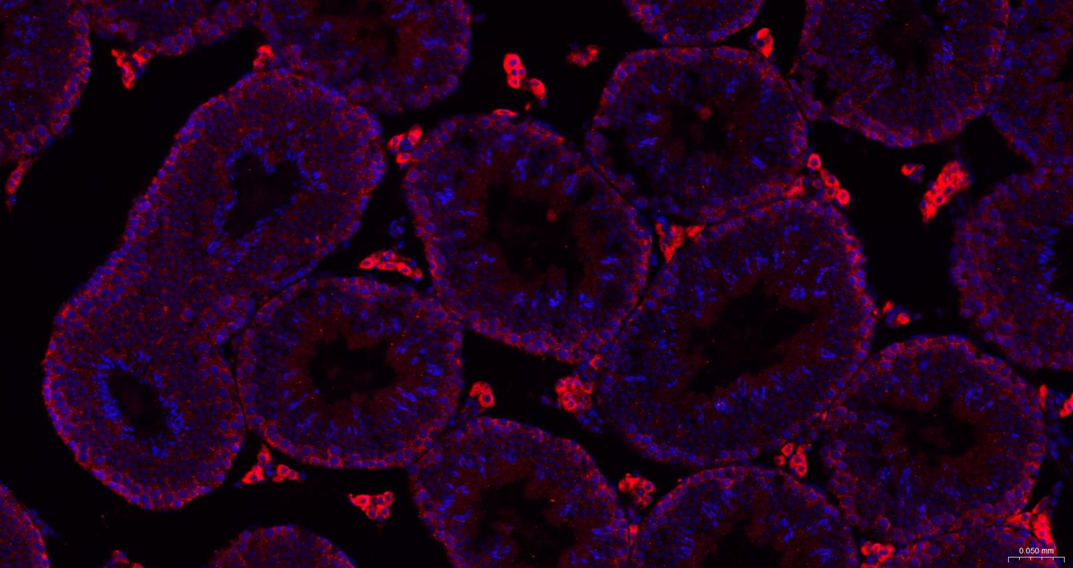Paraformaldehyde-fixed, paraffin embedded Mouse Testicles; Antigen retrieval by boiling in sodium citrate buffer (pH6.0) for 15 min; The section was incubated with HSP105 Monoclonal Antibody, Unconjugated (bsm-61340R) at 1:200 overnight at 4°C. Followed by conjugated Goat Anti-Ratbbit IgG antibody (Red, bs-0295G-BF594), DAPI (blue, C02-04002) was used to stain the cell nuclei.