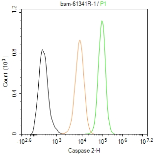 The Hela (H) cells were fixed with 4% PFA (10 min at r.t.) and then permeabilized with 90% ice-cold methanol for 20 min at -20℃,the cells then were incubated in 5%BSA to block non-specific protein-protein interactions (30 min at r.t.), followed by secondary antibody incubation for 40 min at room temperature. Primary Antibody (green):Rabbit Anti-Caspase 2 antibody (bsm-61341R,1:100); Isotype Control (orange): Rabbit IgG (bs-0295P). Blank control (black): PBS. Acquisition of 20,000 events was performed.