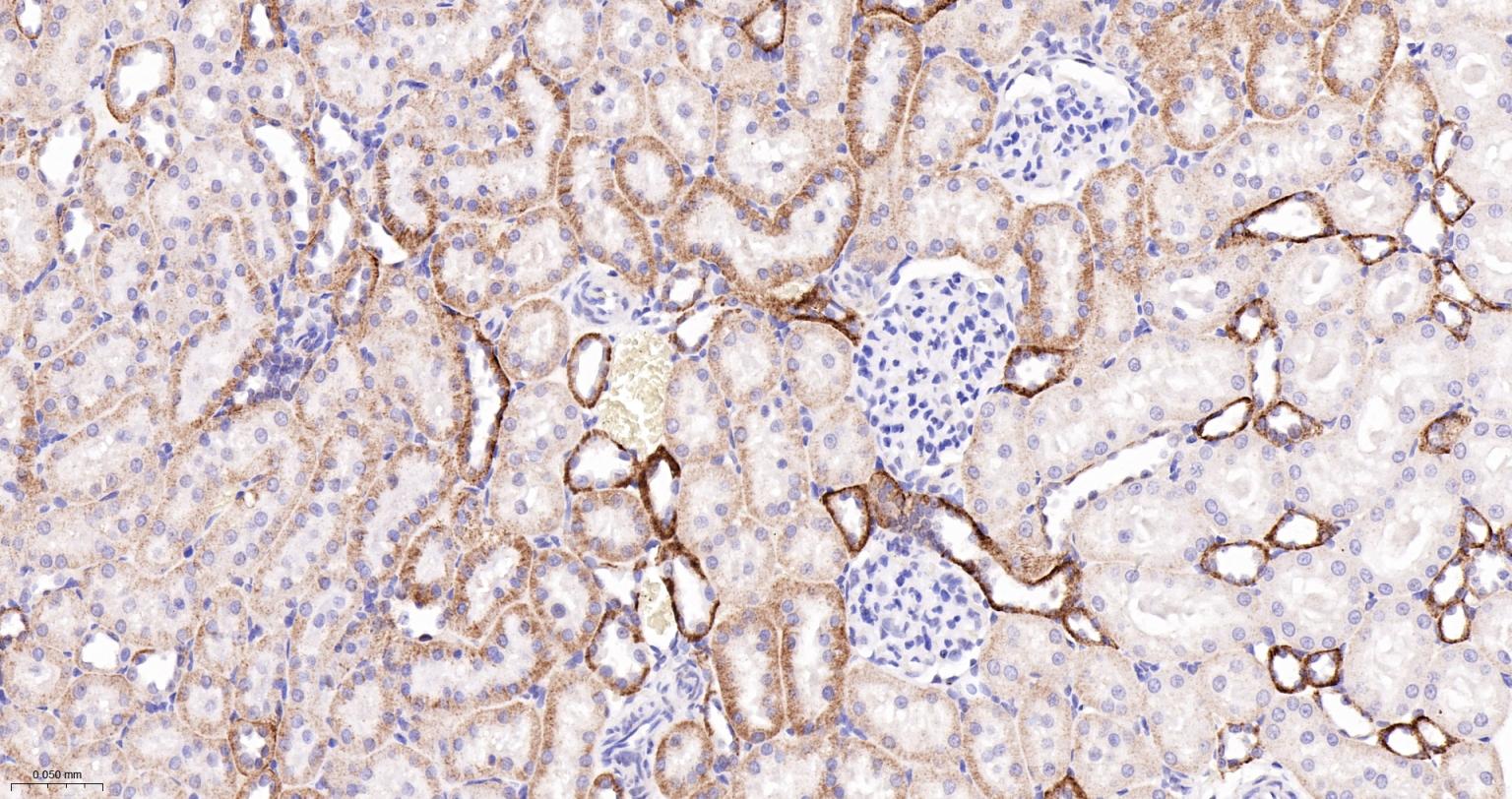 Paraformaldehyde-fixed, paraffin embedded Rat Kidney; Antigen retrieval by boiling in sodium citrate buffer (pH6.0) for 15 min; The section was incubated with Caspase 2 Monoclonal Antibody, Unconjugated (bsm-61341R) at 1:200 overnight at 4°C, followed by conjugation to the bs-0295G-HRP and DAB (C-0010) staining.