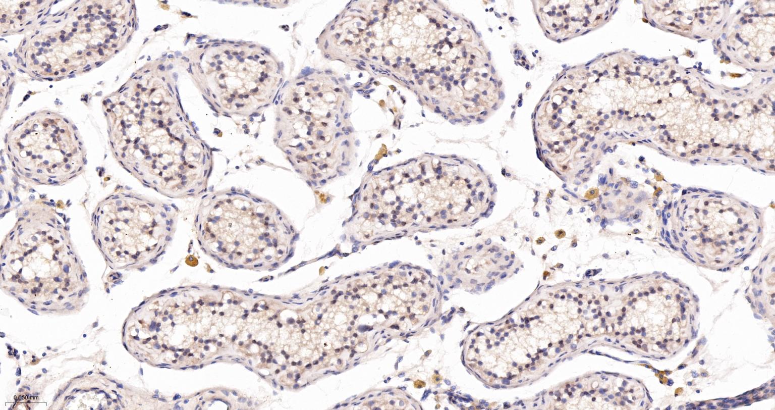Paraformaldehyde-fixed, paraffin embedded Mouse Testicles; Antigen retrieval by boiling in sodium citrate buffer (pH6.0) for 15 min; The section was incubated with Caspase 2 Monoclonal Antibody, Unconjugated (bsm-61341R) at 1:200 overnight at 4°C, followed by conjugation to the bs-0295G-HRP and DAB (C-0010) staining.