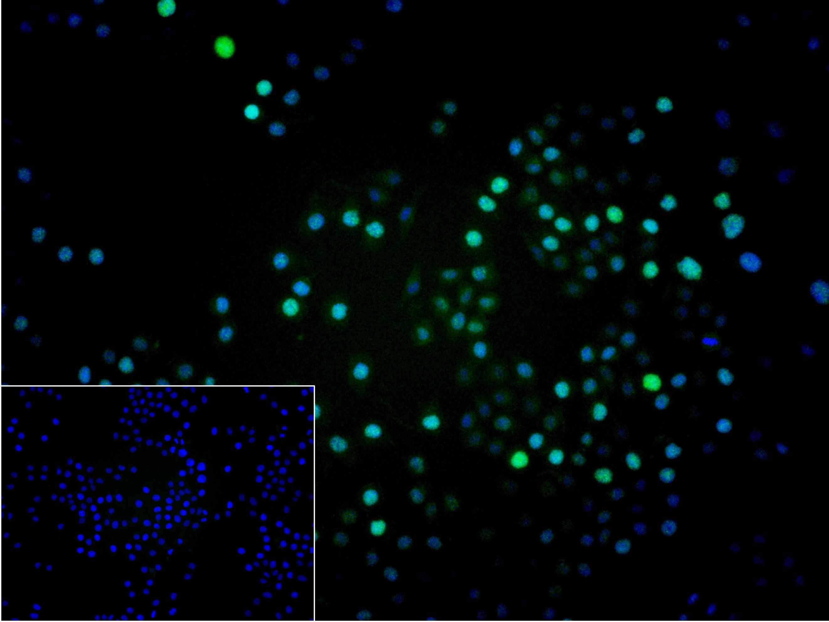 4% Paraformaldehyde-fixed Hela (H) cell; Triton X-100 at r.t. for 20 min; Antibody incubation with (CDCA5) monoclonal Antibody, unconjugated (bsm-61346R) 1:100, 90 min at 37°C; followed by conjugated Goat Anti-Rabbit IgG antibody (green, bs-60295G-BF488) at 37°C for 90 min, DAPI (blue, C02-04002) was used to stain the cell nuclei. PBS instead of the primary antibody was used as the blank control.