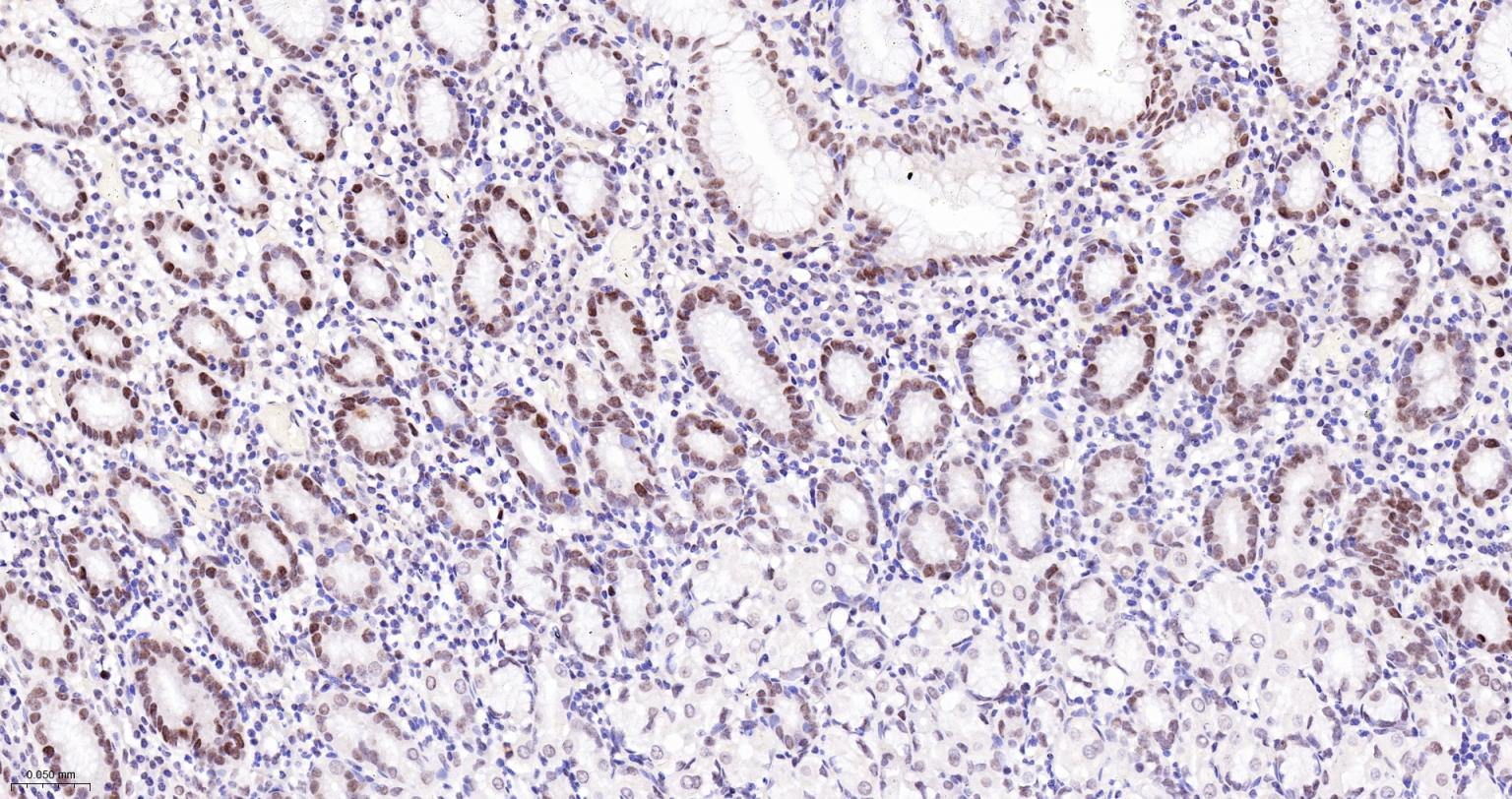Paraformaldehyde-fixed, paraffin embedded Human Stomach; Antigen retrieval by boiling in sodium citrate buffer (pH6.0) for 15 min; The section was incubated with CDCA5 Monoclonal Antibody, Unconjugated (bsm-61346R) at 1:200 overnight at 4°C, followed by conjugation to the bs-0295G-HRP and DAB (C-0010) staining.