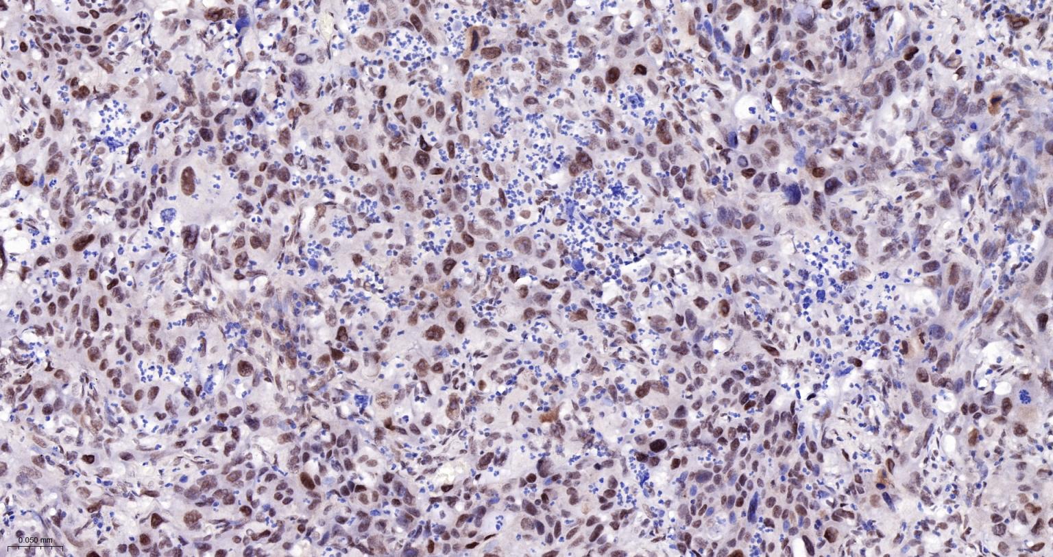 Paraformaldehyde-fixed, paraffin embedded Human Lung Cancer; Antigen retrieval by boiling in sodium citrate buffer (pH6.0) for 15 min; The section was incubated with CDCA5 Monoclonal Antibody, Unconjugated (bsm-61346R) at 1:200 overnight at 4°C, followed by conjugation to the bs-0295G-HRP and DAB (C-0010) staining.