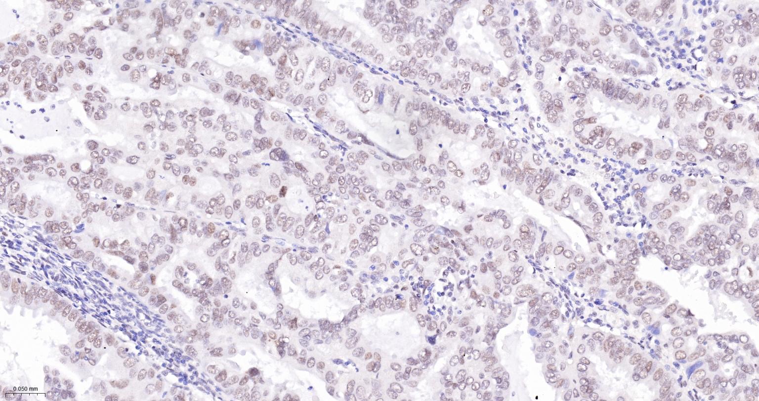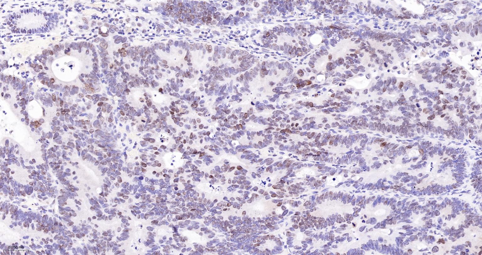 Paraformaldehyde-fixed, paraffin embedded Human Endometrial Cancer; Antigen retrieval by boiling in sodium citrate buffer (pH6.0) for 15 min; The section was incubated with CDCA5 Monoclonal Antibody, Unconjugated (bsm-61346R) at 1:200 overnight at 4°C, followed by conjugation to the bs-0295G-HRP and DAB (C-0010) staining.