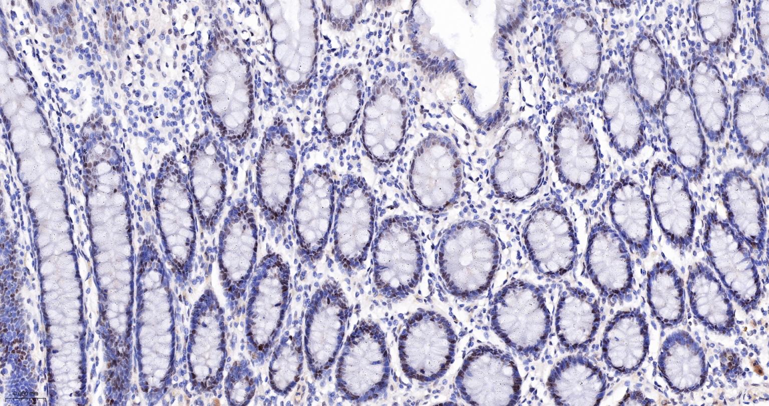Paraformaldehyde-fixed, paraffin embedded Human Colon; Antigen retrieval by boiling in sodium citrate buffer (pH6.0) for 15 min; The section was incubated with CDCA5 Monoclonal Antibody, Unconjugated (bsm-61346R) at 1:200 overnight at 4°C, followed by conjugation to the bs-0295G-HRP and DAB (C-0010) staining.
