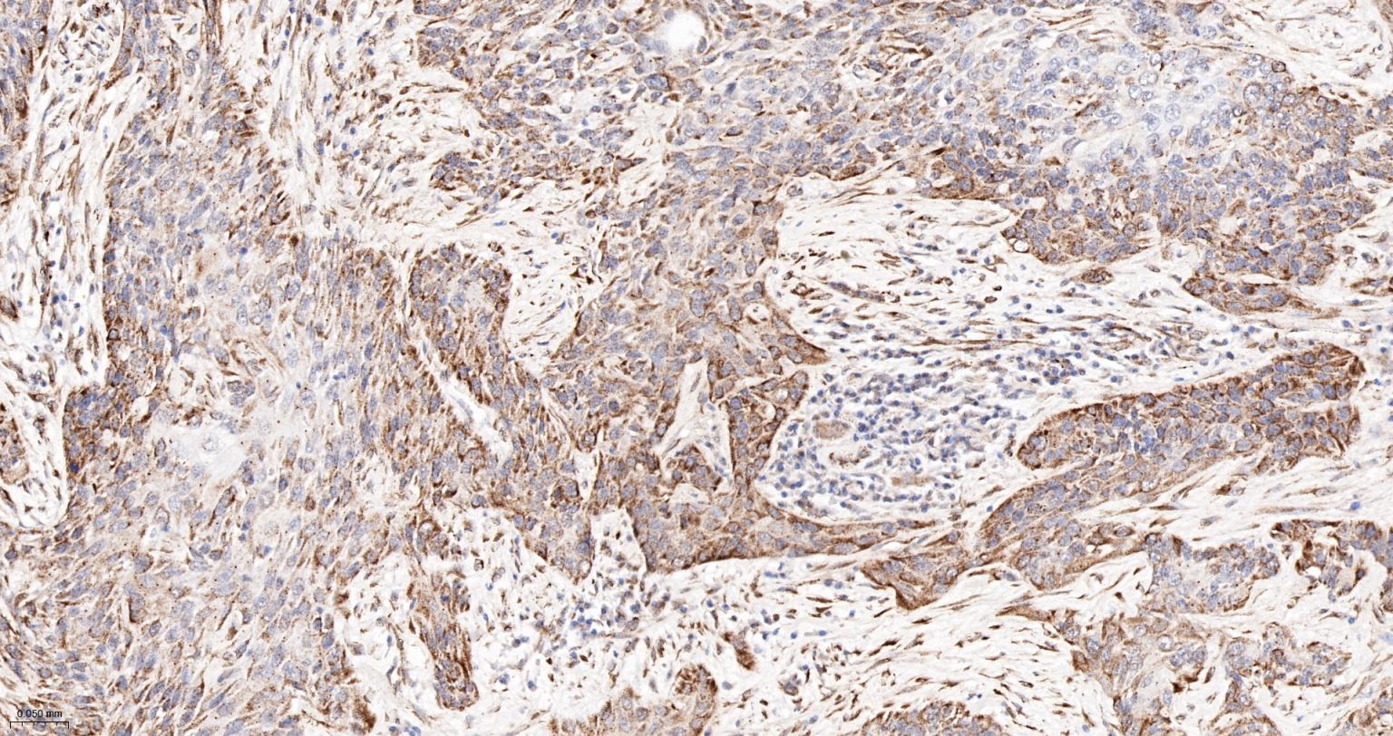 Paraformaldehyde-fixed, paraffin embedded Human Esophageal Cancer; Antigen retrieval by boiling in sodium citrate buffer (pH6.0) for 15 min; The section was incubated with HSP47 Monoclonal Antibody, Unconjugated (bsm-61347R) at 1:200 overnight at 4°C, followed by conjugation to the bs-0295G-HRP and DAB (C-0010) staining.