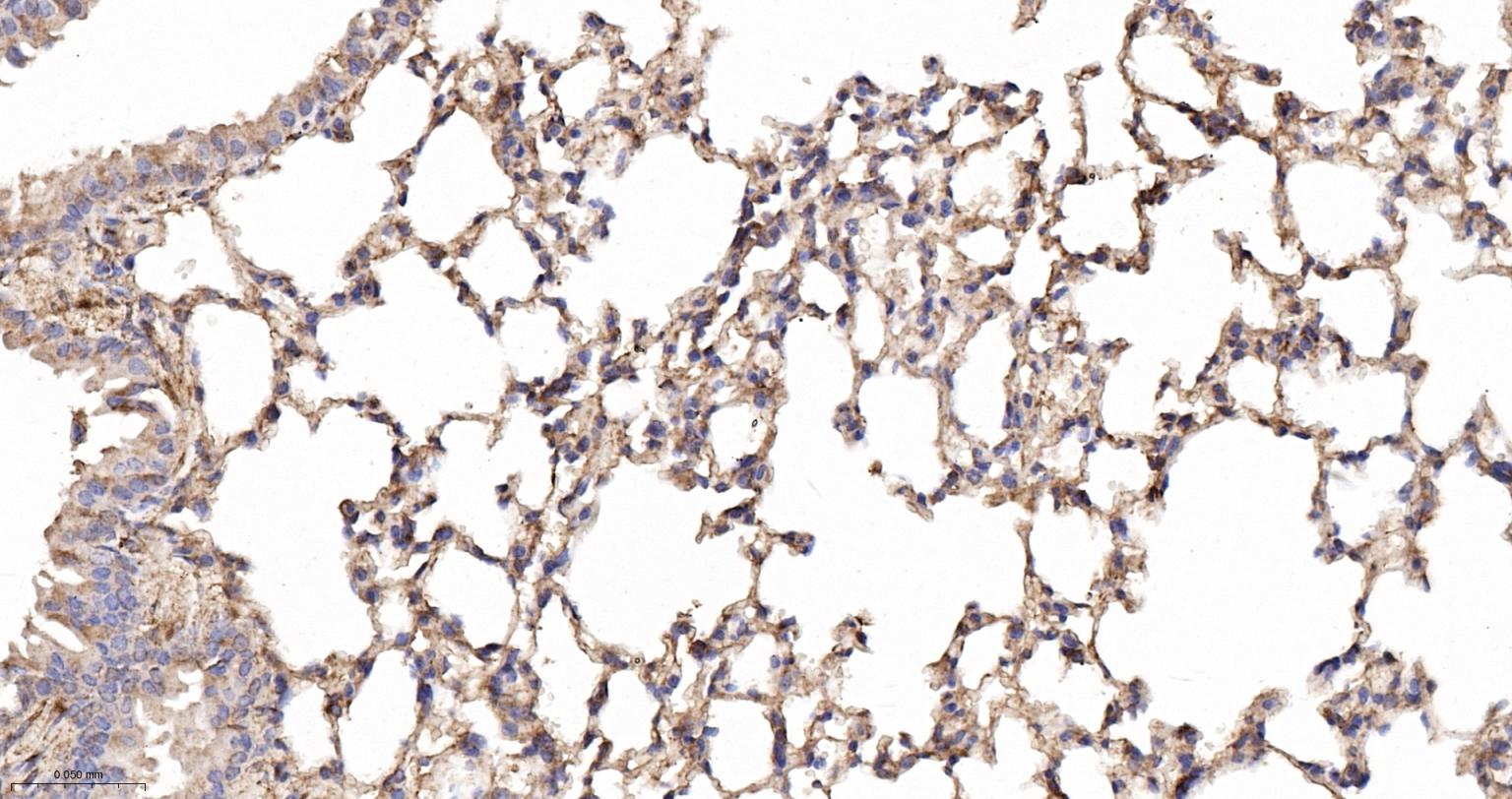 Paraformaldehyde-fixed, paraffin embedded Mouse Lung; Antigen retrieval by boiling in sodium citrate buffer (pH6.0) for 15 min; The section was incubated with HSP47 Monoclonal Antibody, Unconjugated (bsm-61347R) at 1:200 overnight at 4°C, followed by conjugation to the bs-0295G-HRP and DAB (C-0010) staining.