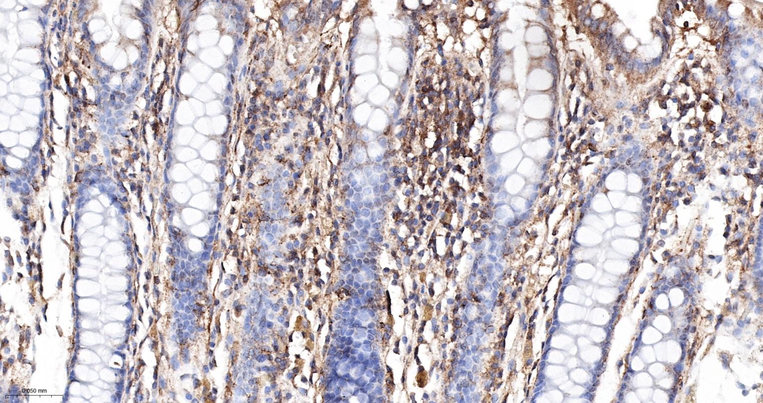 Paraformaldehyde-fixed, paraffin embedded Human Colon; Antigen retrieval by boiling in sodium citrate buffer (pH6.0) for 15 min; The section was incubated with HSP47 Monoclonal Antibody, Unconjugated (bsm-61347R) at 1:200 overnight at 4°C, followed by conjugation to the bs-0295G-HRP and DAB (C-0010) staining.