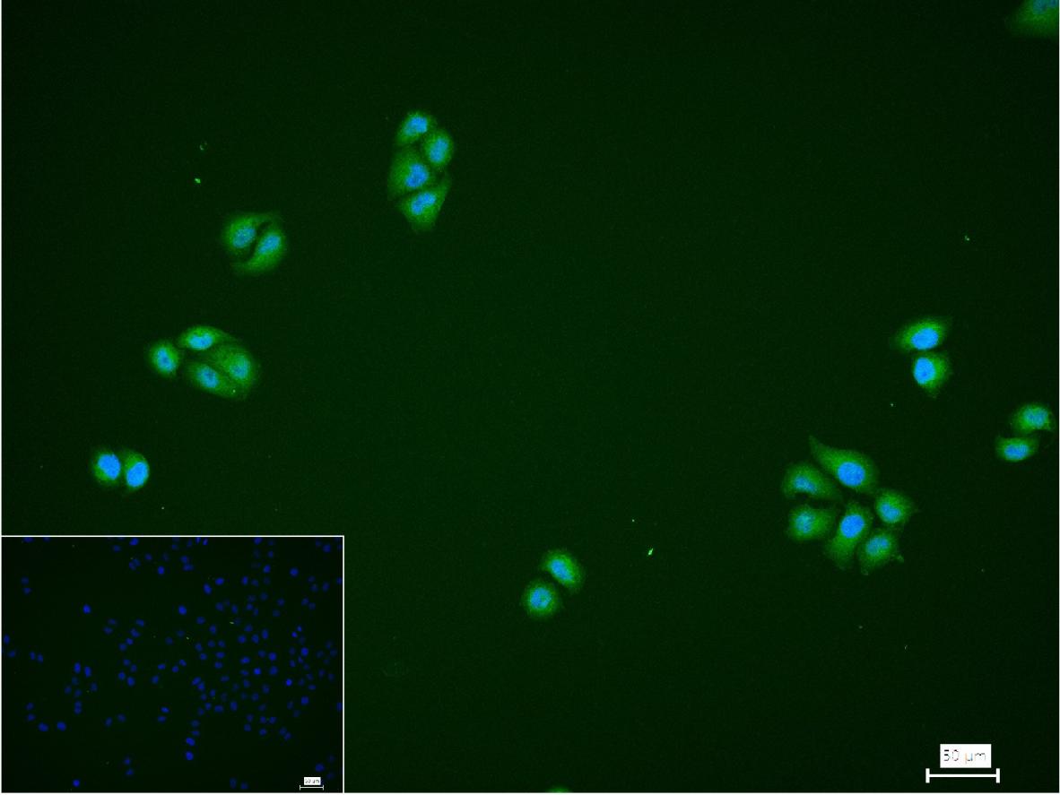 4% Paraformaldehyde-fixed Hela (H) cell; Triton X-100 at r.t. for 20 min; Antibody incubation with (Sumo 2/3) monoclonal Antibody, unconjugated (bsm-61351R) 1:100, 90 min at 37°C; followed by conjugated Goat Anti-Rabbit IgG antibody (green, bs-40295G-FITC) at 37°C for 90 min, DAPI (blue, C02-04002) was used to stain the cell nuclei. PBS instead of the primary antibody was used as the blank control.