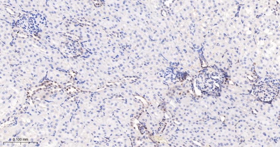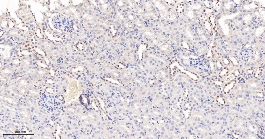 Paraformaldehyde-fixed, paraffin embedded Rat Kidney; Antigen retrieval by boiling in sodium citrate buffer (pH6.0) for 15 min; The section was incubated with Sumo2/3 Monoclonal Antibody, Unconjugated (bsm-61351R) at 1:200 overnight at 4°C, followed by conjugation to the bs-0295G-HRP and DAB (C-0010) staining.