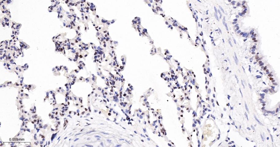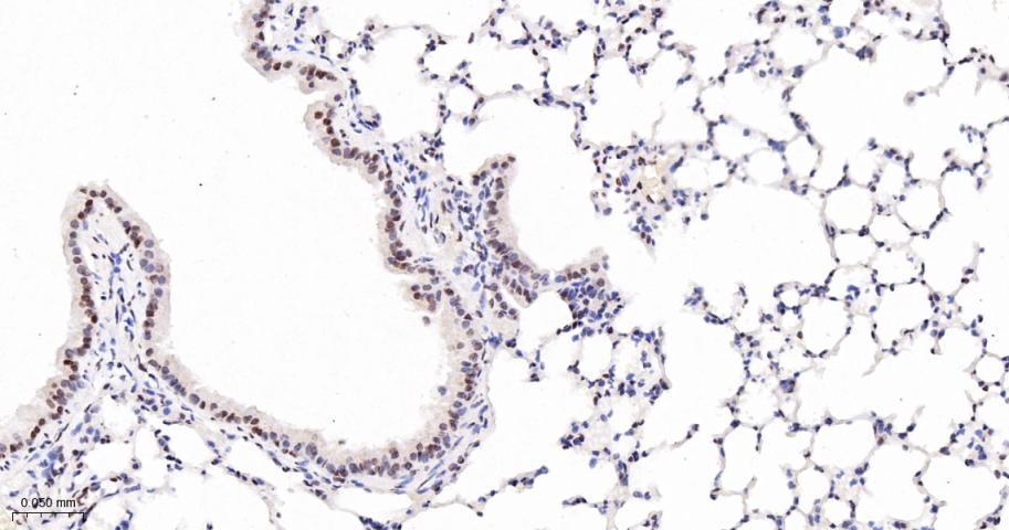 Paraformaldehyde-fixed, paraffin embedded Mouse Lung; Antigen retrieval by boiling in sodium citrate buffer (pH6.0) for 15 min; The section was incubated with Sumo2/3 Monoclonal Antibody, Unconjugated (bsm-61351R) at 1:200 overnight at 4°C, followed by conjugation to the bs-0295G-HRP and DAB (C-0010) staining.