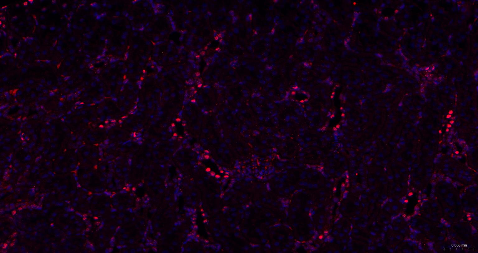 Paraformaldehyde-fixed, paraffin embedded Rat Kidney; Antigen retrieval by boiling in sodium citrate buffer (pH6.0) for 15 min; The section was incubated with Sumo2/3 Monoclonal Antibody, Unconjugated (bsm-61351R) at 1:200 overnight at 4°C. Followed by conjugated Goat Anti-Rabbit IgG antibody (Red, bs-0295G-BF594), DAPI (blue, C02-04002) was used to stain the cell nuclei.
