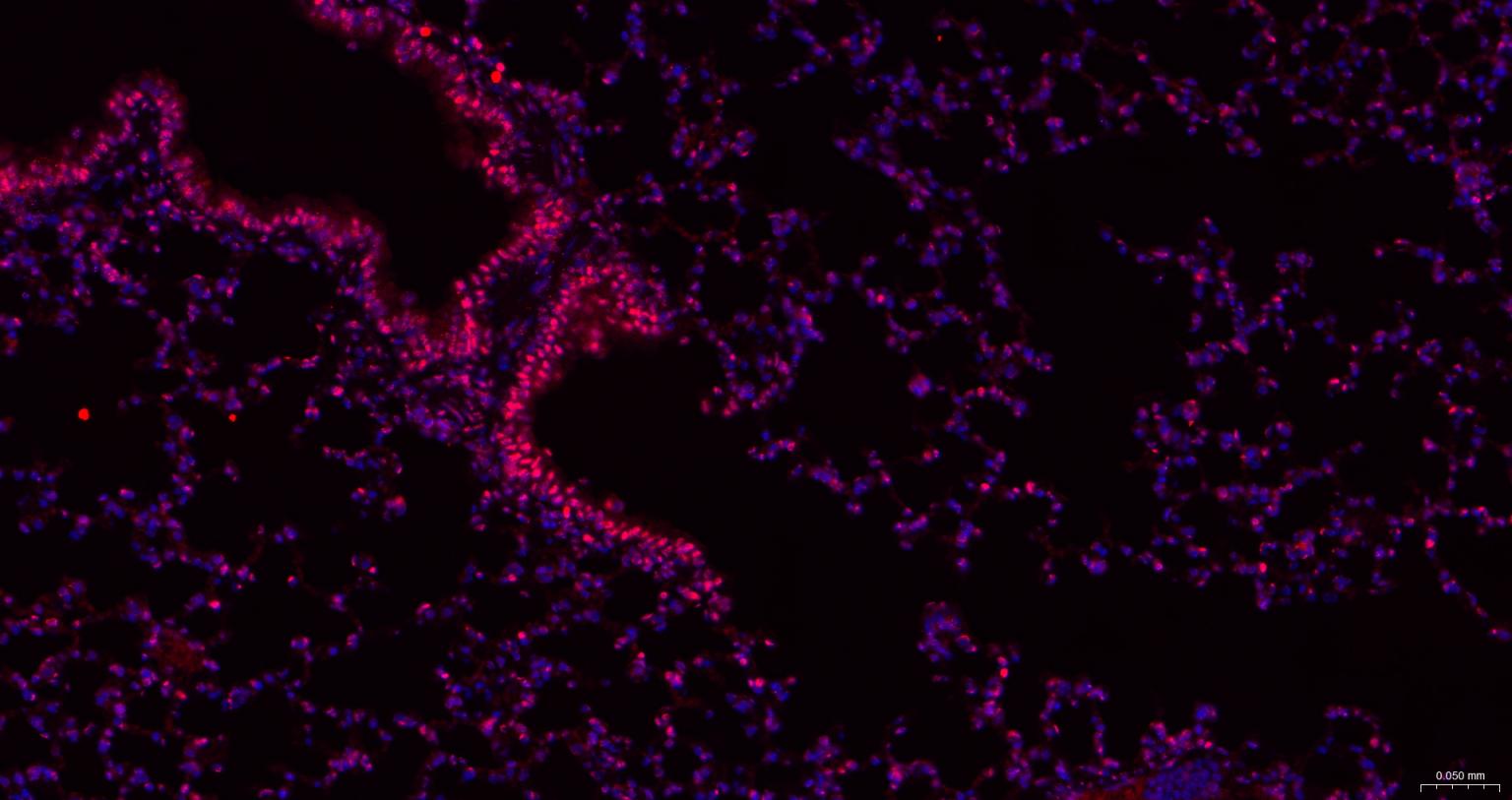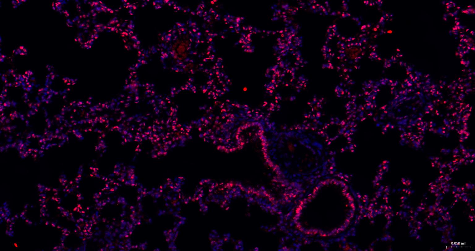 Paraformaldehyde-fixed, paraffin embedded Rat Lung; Antigen retrieval by boiling in sodium citrate buffer (pH6.0) for 15 min; The section was incubated with Sumo2/3 Monoclonal Antibody, Unconjugated (bsm-61351R) at 1:200 overnight at 4°C. Followed by conjugated Goat Anti-Rabbit IgG antibody (Red, bs-0295G-BF594), DAPI (blue, C02-04002) was used to stain the cell nuclei.