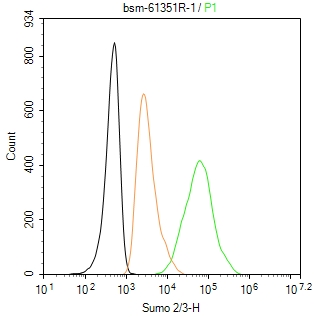 The SH-SY5Y (H) cells were fixed with 4% PFA (10 min at r.t.) and then permeabilized with 90% ice-cold methanol for 20 min at -20℃,the cells then were incubated in 5%BSA to block non-specific protein-protein interactions (30 min at r.t.), followed by secondary antibody incubation for 40 min at room temperature. Primary Antibody (green):Rabbit Anti-Sumo 2/3 antibody (bsm-61351R,1:100); Isotype Control (orange): Rabbit IgG (bs-0295P). Blank control (black): PBS. Acquisition of 20,000 events was performed.