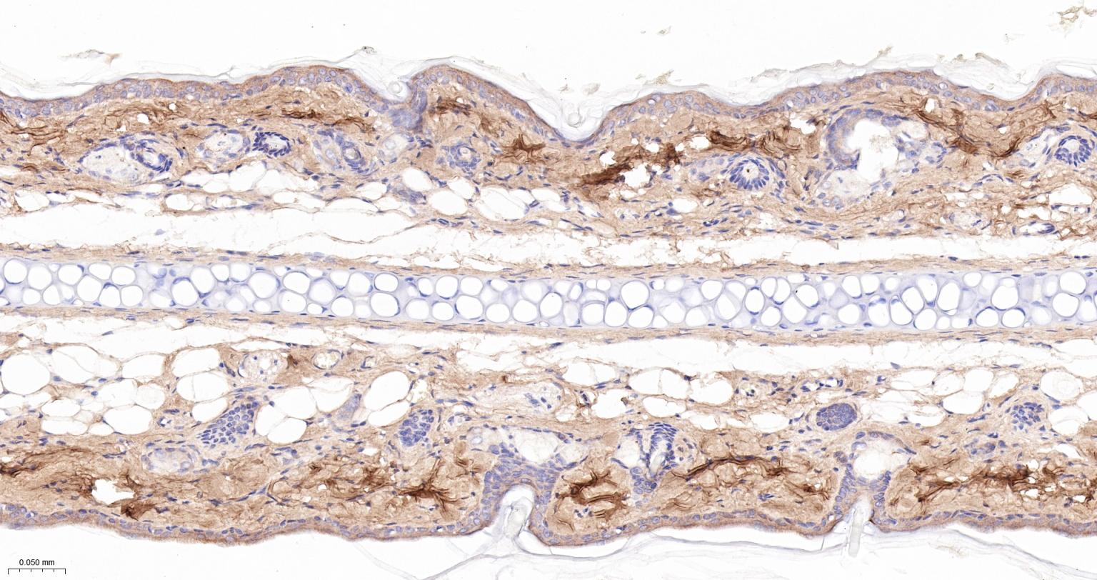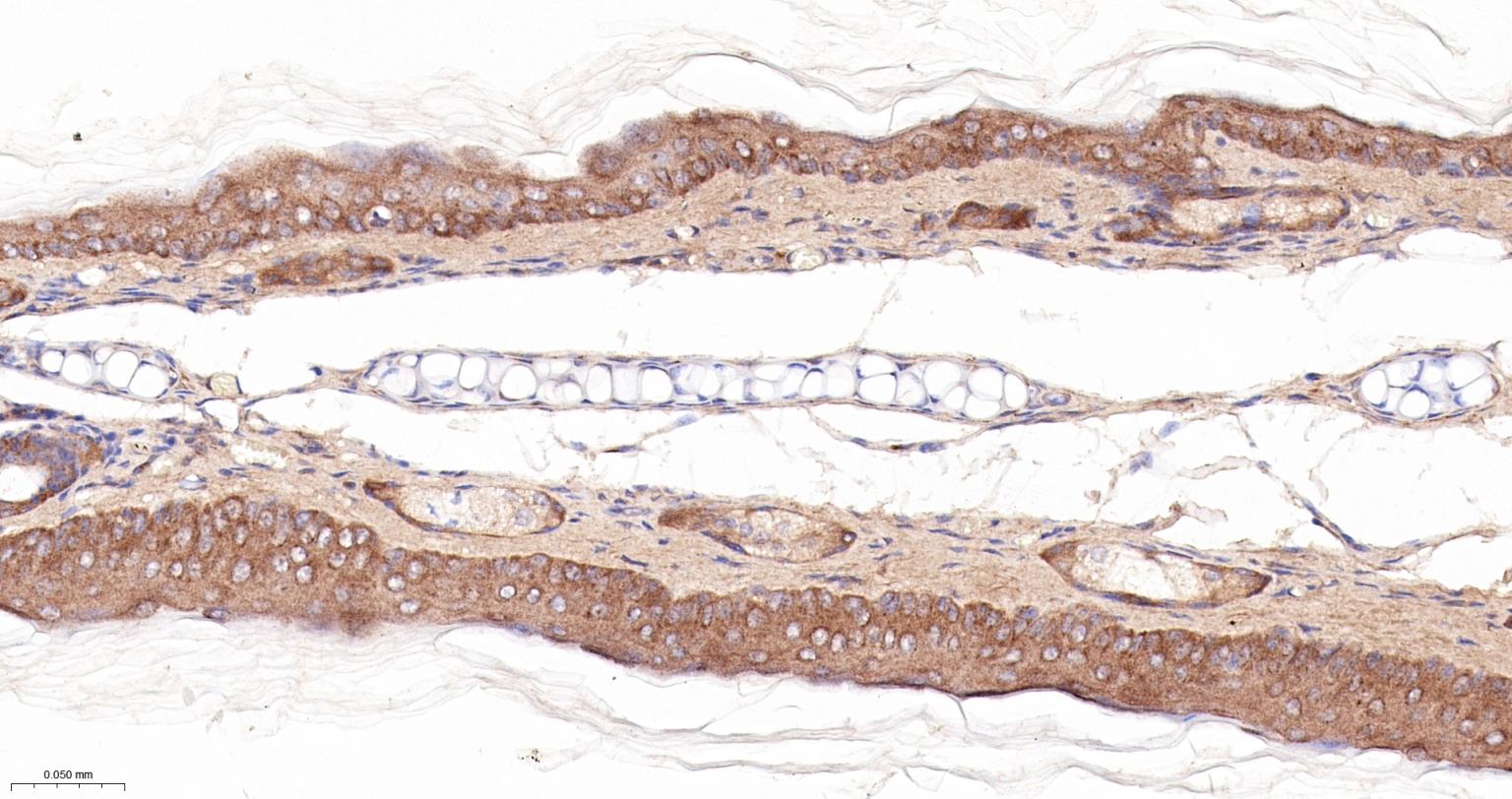 Paraformaldehyde-fixed, paraffin embedded Mouse Skin; Antigen retrieval by boiling in sodium citrate buffer (pH6.0) for 15 min; The section was incubated with Caspase 14 Monoclonal Antibody, Unconjugated (bsm-61356R) at 1:200 overnight at 4°C, followed by conjugation to the bs-0295G-HRP and DAB (C-0010) staining.
